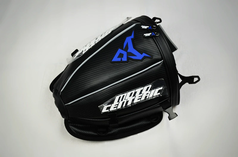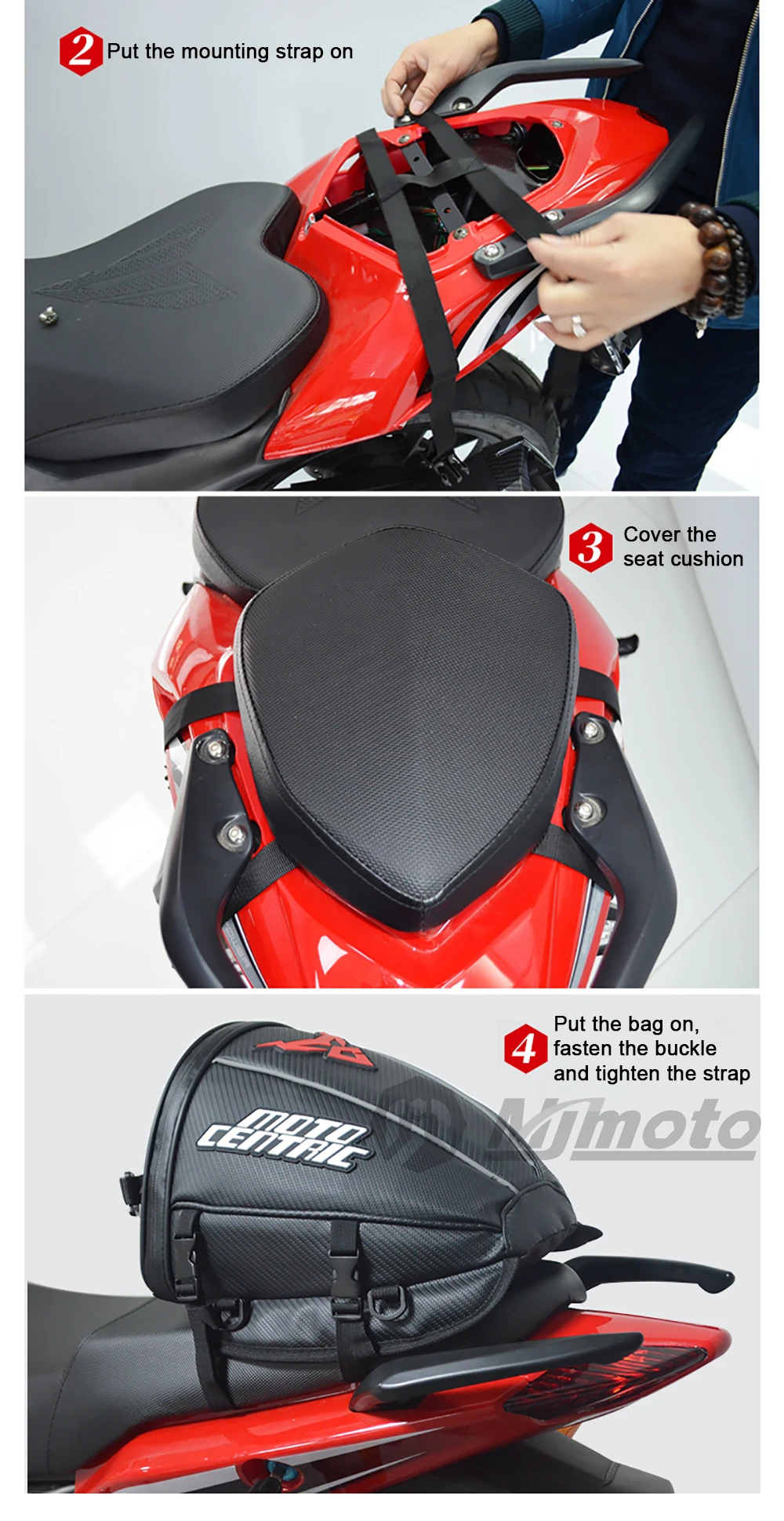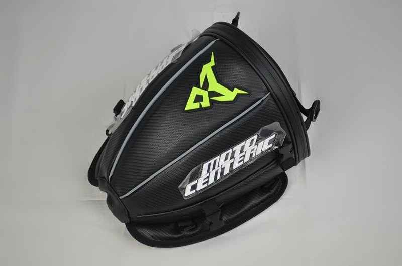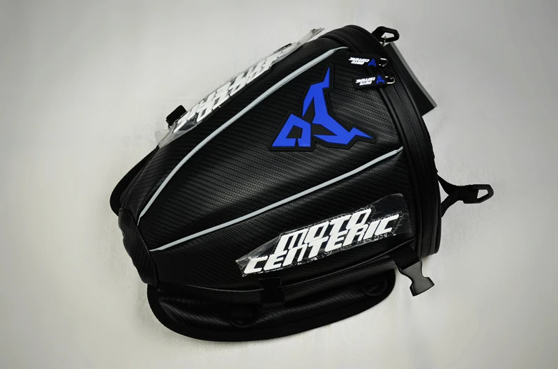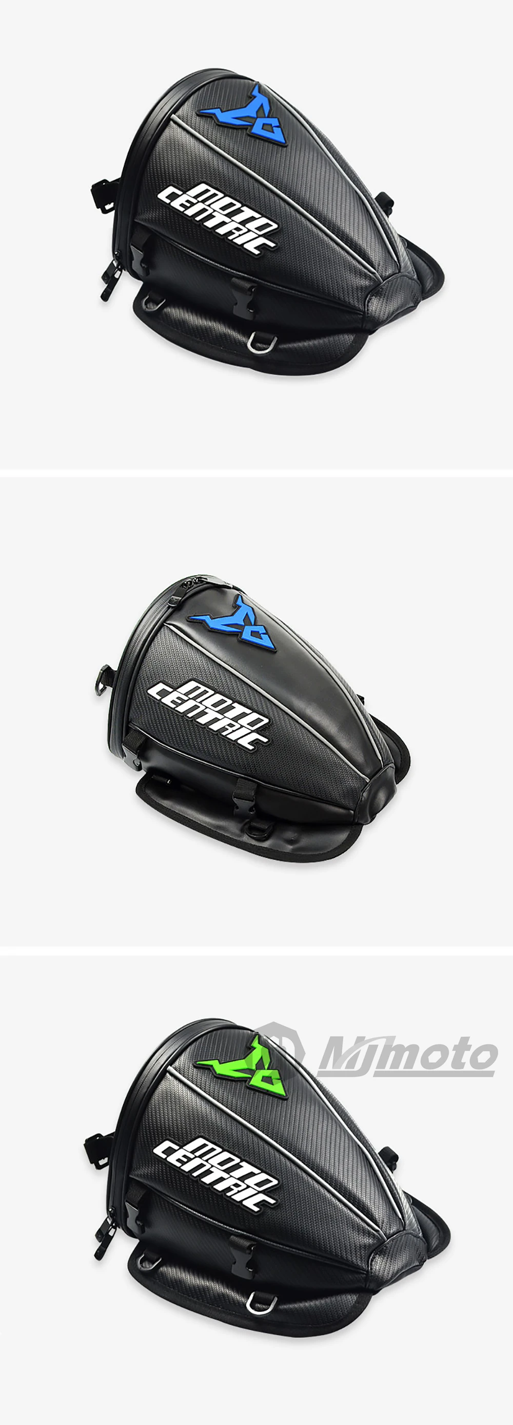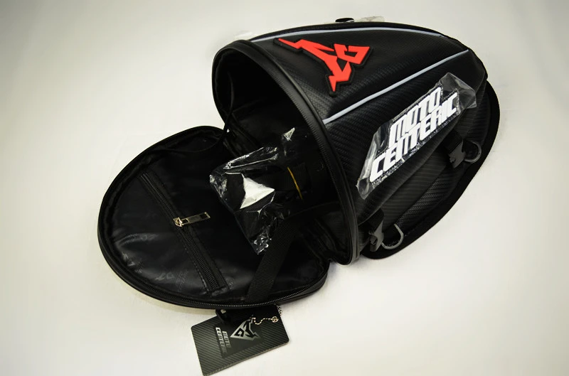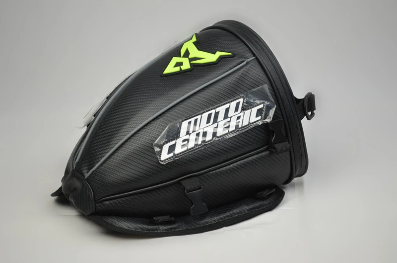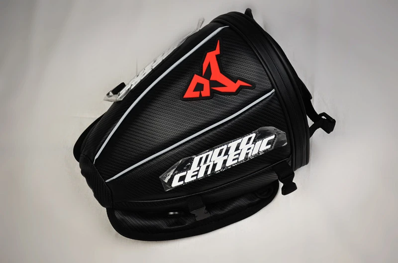 The MOTOCENTRIC rear seat bag features a sleek carbon fiber pattern, adding a touch of sophistication to your ride.
