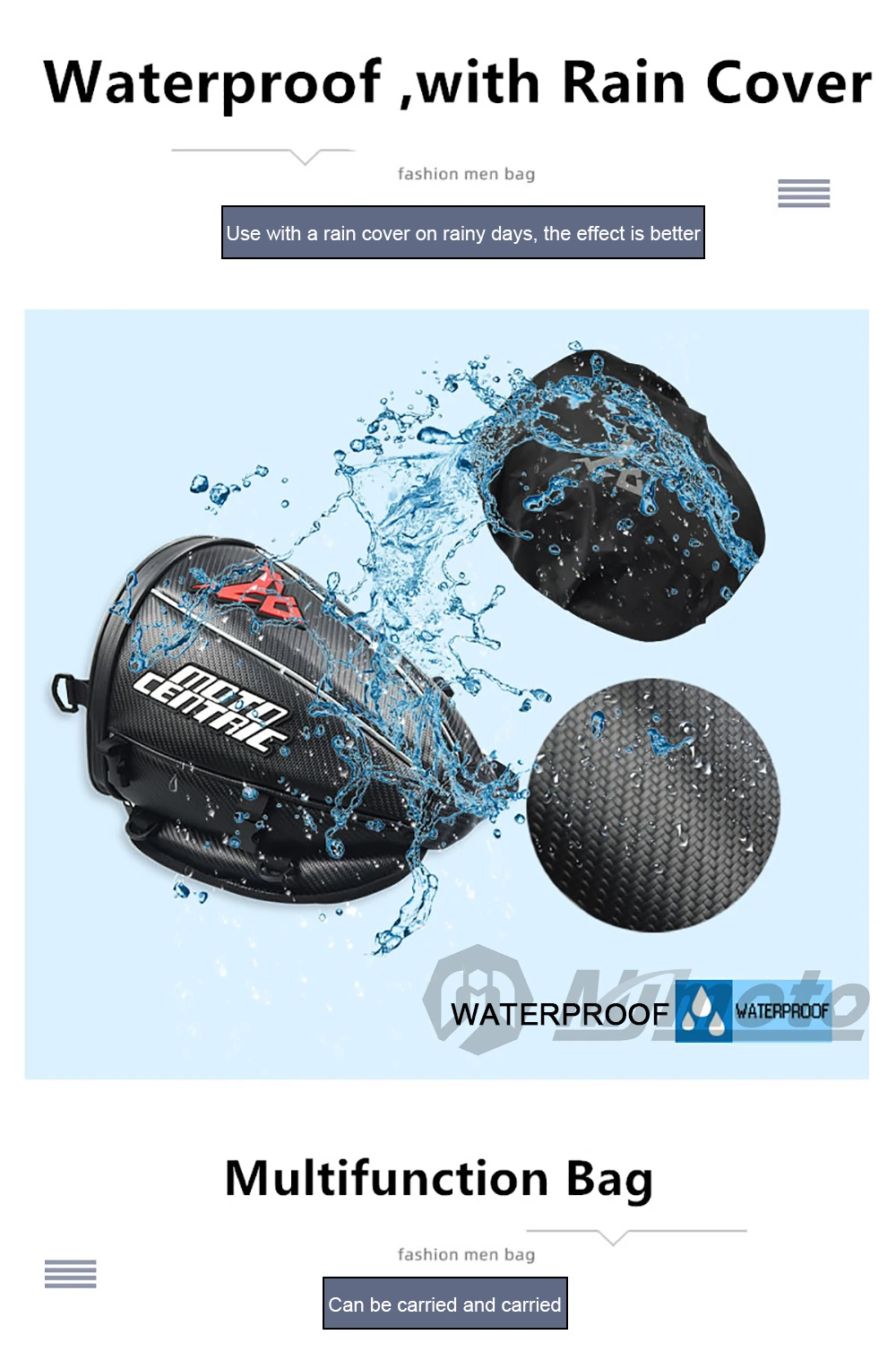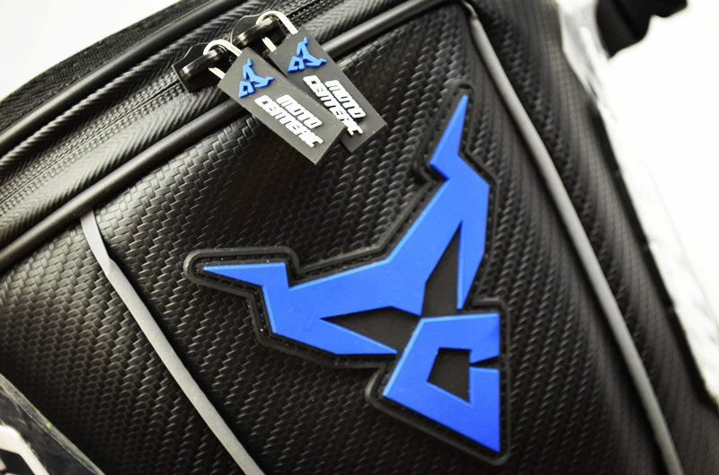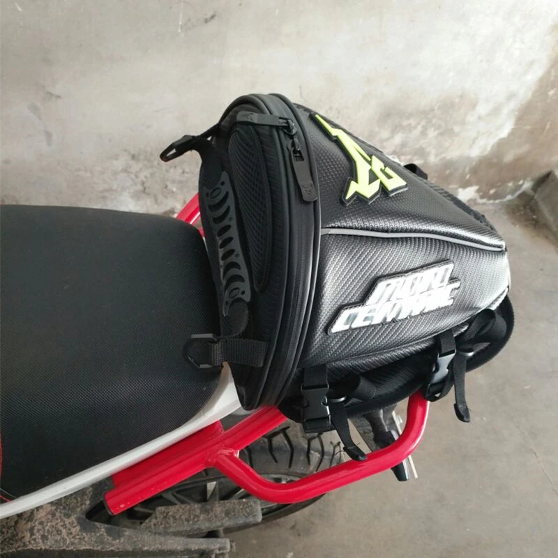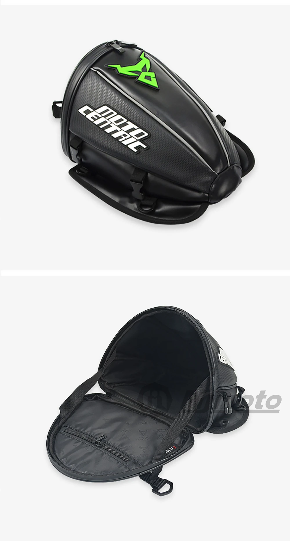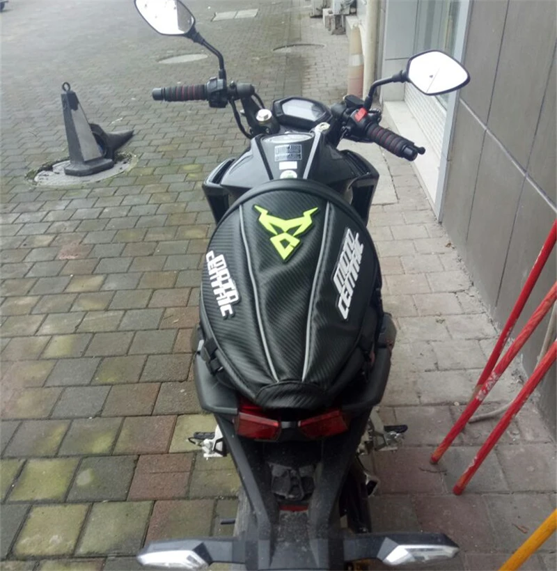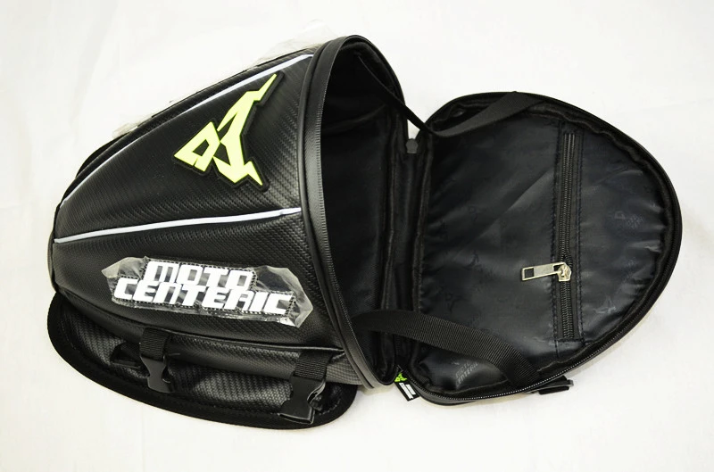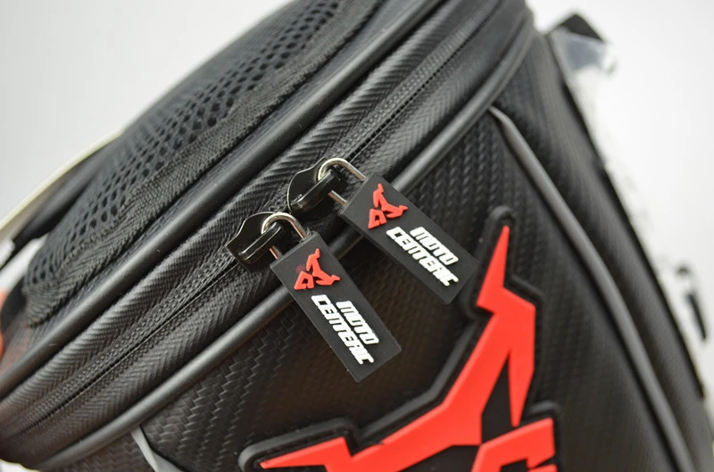 The MOTOCENTRIC rear seat bag features a sleek carbon fiber pattern, adding a touch of sophistication to your ride.
